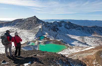 The Tongariro Crossing is New Zealand's best 1 day walk taking you through Tongariro National Park and World Heritage Area. The park is dominated by three majestic volcanoes, Mt Tongariro, Mt Ngauruhoe and Mt Ruapehu. During your 19 km hike, you'll follow a well-formed track leading up the saddle between Mt Ngauruhoe and Mt Tongariro. The landscape on Tongariro is peppered with the different coloured and shaped craters, scoured volcanic rocks, mountain springs, and brightly coloured emerald lakes. During winter the tours offer you the chance to experience this magnificent landscape covered in snow.